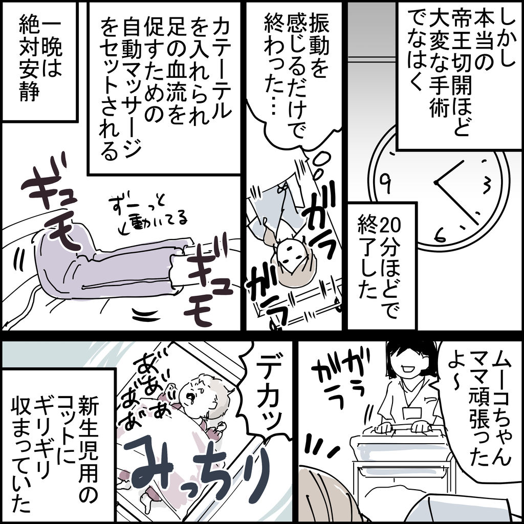 滞りなく終わり、自動足もみ器のようなものをセットされ(下半身麻酔しているので、足に血栓ができないようにするための処置らしい)、それが意外と気持ちよかった。