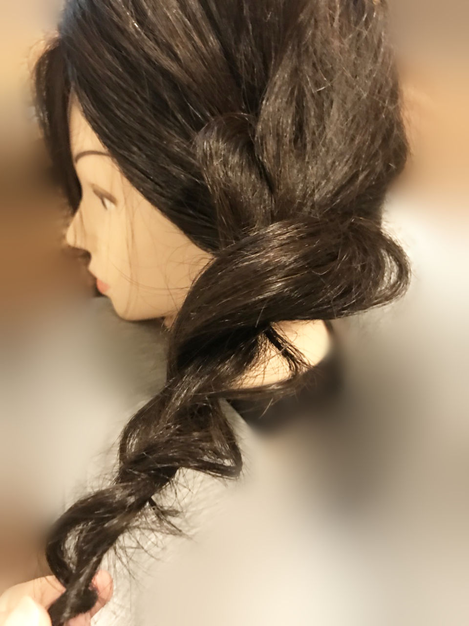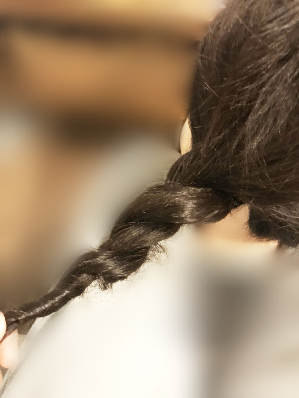 まず、髪の毛を二つに分けて、左右どっちか寄りに、その2本をねじります。