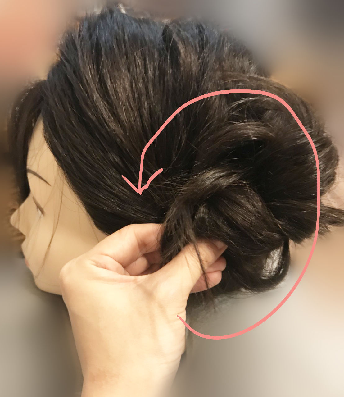次に、ねじった髪からおくれ毛をひっぱりだします。