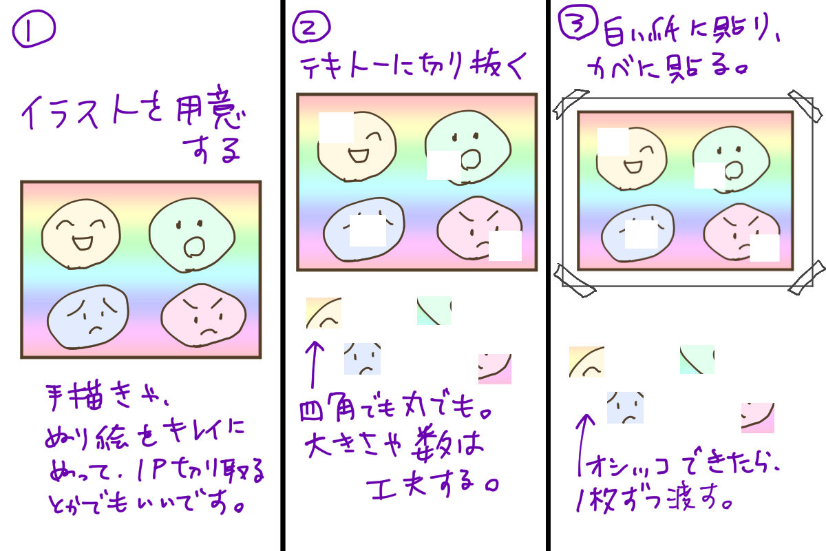 というものだったのですが、これお絵描きソフト使い慣れてる人じゃないとハードル高いし、パソコンやプリンターが無い環境の人ももちろん居るから、おすすめできるやり方じゃないなと思い、除外しました。