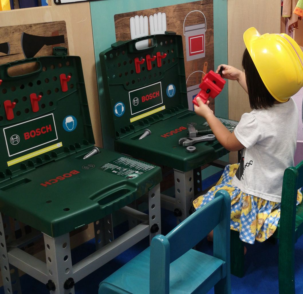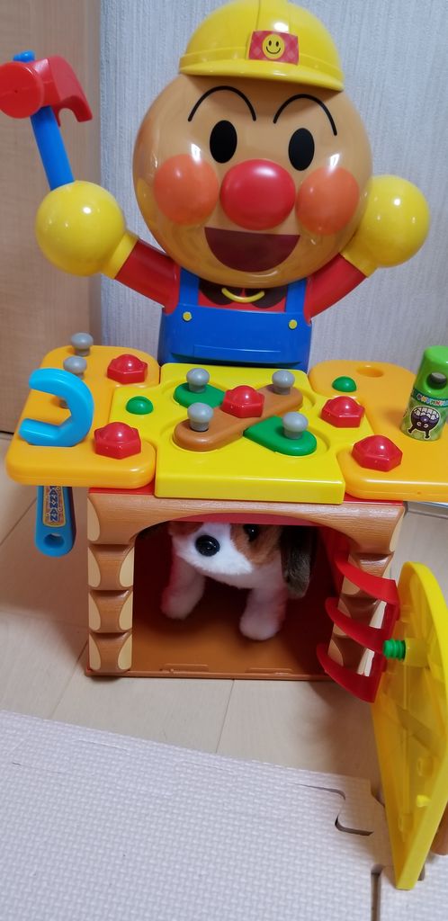 アンパンマンの大工セットは、秋に福岡に行った時にプレイルームで工具に夢中だったので
