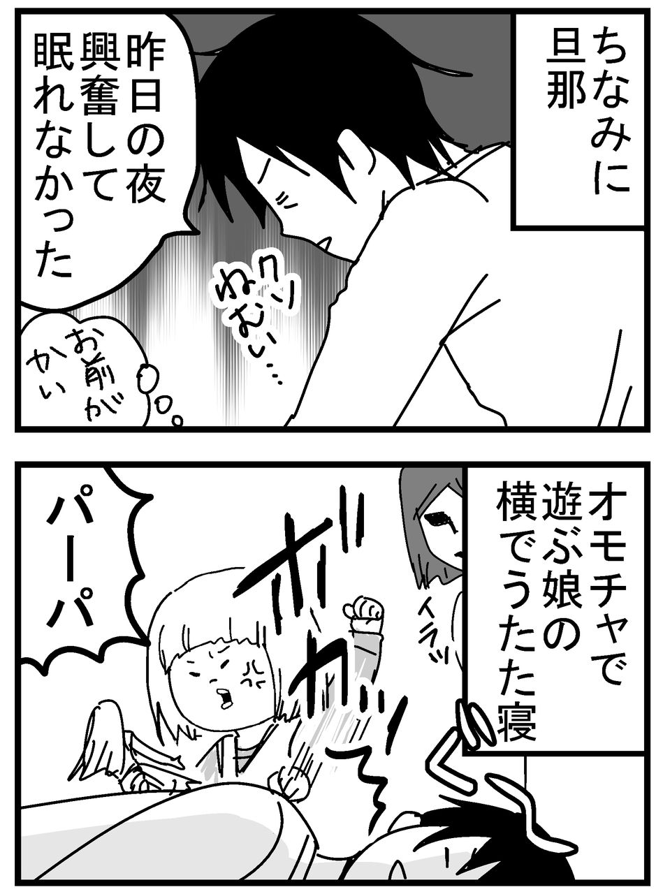 旦那、繁忙期で疲れてるのはわかるけど、せっかくの休みなんだから寝てないで子供に付き合ってあげてほしくて、ついイラッとしてしまいました…😅その後ムーコに叩き起こされて付き合ってあげてたから良かったですが(笑)