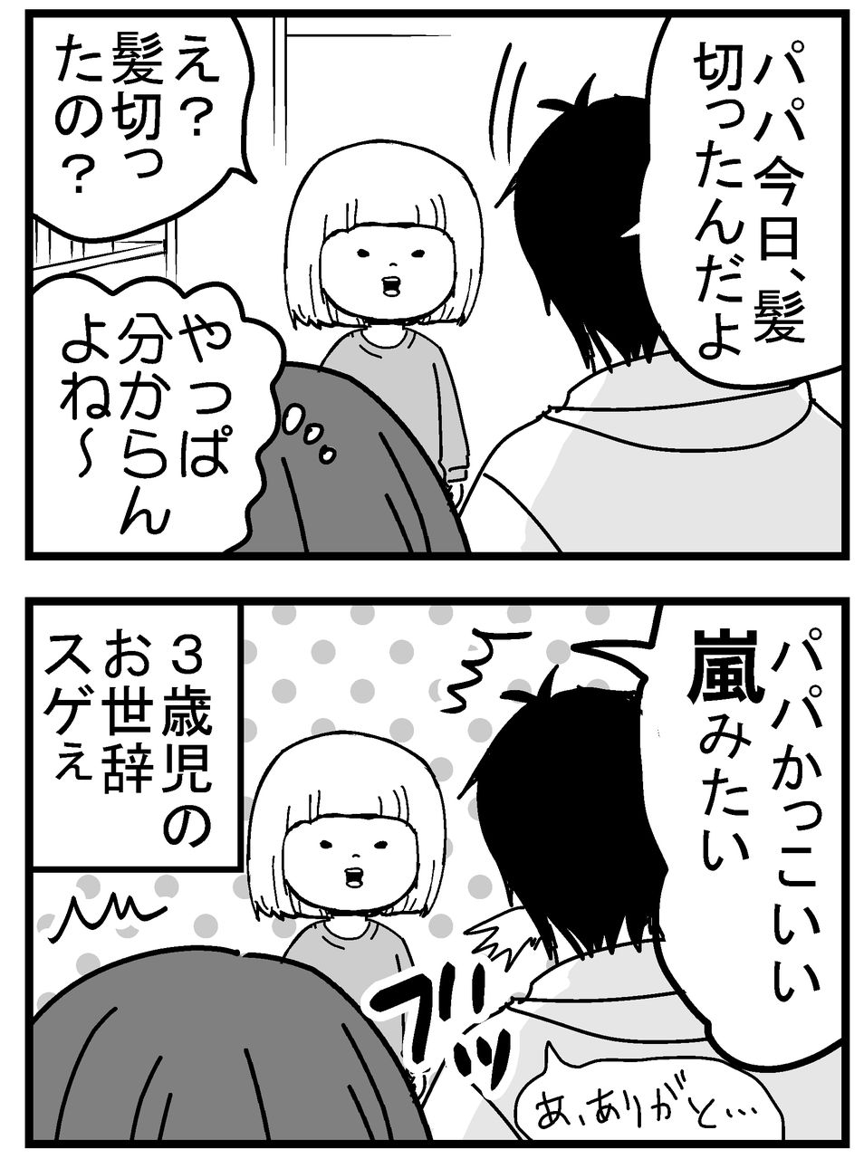【育児漫画147】3歳児のお世辞 2019年01月21日 (3歳8ヶ月)突然の嵐。特に家のテレビで嵐を見ているというワケではないのですが…。どこかで私が「嵐だ」と言ったのを覚えていたのか、園で覚えてきたのか。まさかこんな事を言うなんてびっくりしました。もちろん旦那は、嵐の誰にも似ていません(;´Д`)↓クリックで応援よろしくお願いします↓↓更新通知が届きますので、お気軽にご登録ください!↓ 「3歳」カテゴリの最新記事 < 前の記事次の記事 > コメント コメント一覧 (2) 1. ちゅーあい 2019年01月21日 19:30 最近うちの子も褒めることを覚えたようで、 吹いたのが、 『 おかあさんすきー!かわいい!だって、太ってるんだもん!』 ガーン!!! ちなみにガリガリの旦那も息子からしたら太っているんだそう、、 意味分かってないのに褒めてくれて嬉しい!親バカw 0 ちくまサラ がしました 2. ちくまサラ 2019年01月22日 00:13 @ちゅーあいさん 意味わかってなくても「太ってる」はショッキングですね😅💦 でも褒めてくれるのって嬉しいですよね~!うちも「ママもパパもばーちゃんもじーちゃんもカワイイ!」って言ってます(笑) 大人の真似なのか、頭をヽ(´ー` )ヨシヨシしてくれたり。今だけなんだろうな~と思うと寂しいけど満喫してます! 0 ちくまサラ がしました コメントフォーム 名前 コメント 記事の評価 リセット リセット 顔 星 情報を記憶 コメントを投稿する