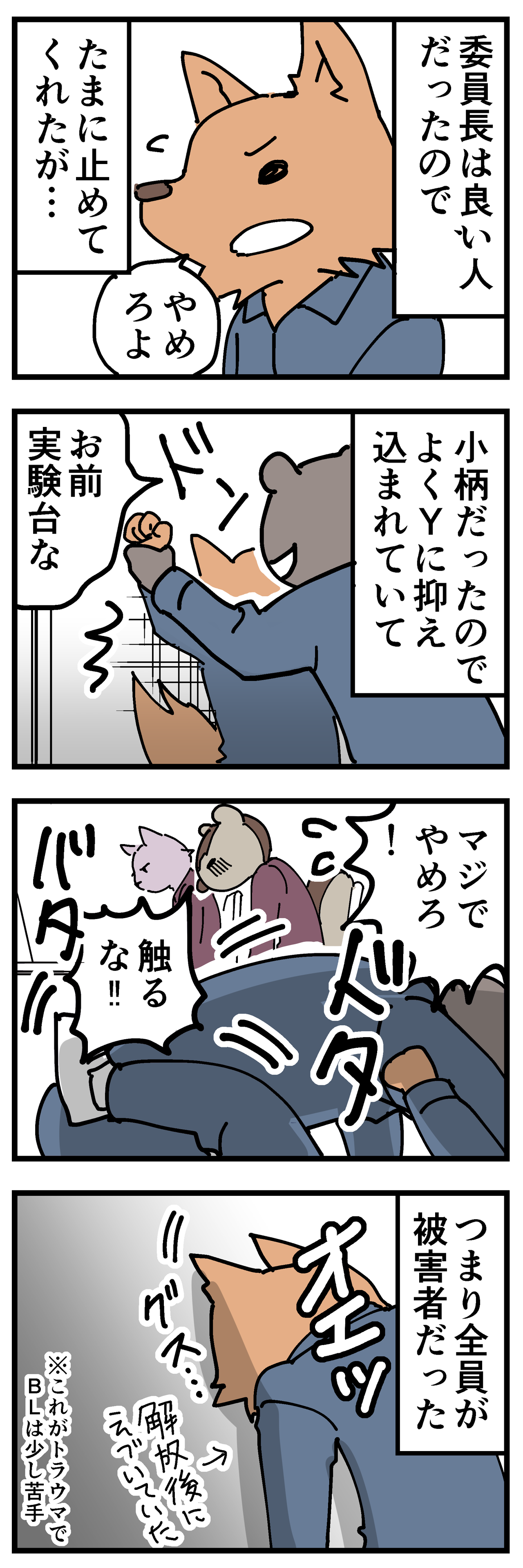 委員長は優しくて、私たちに対するセクハラが酷い時は止めてくれていたのですが、Yは委員長にもセクハラをしていました。