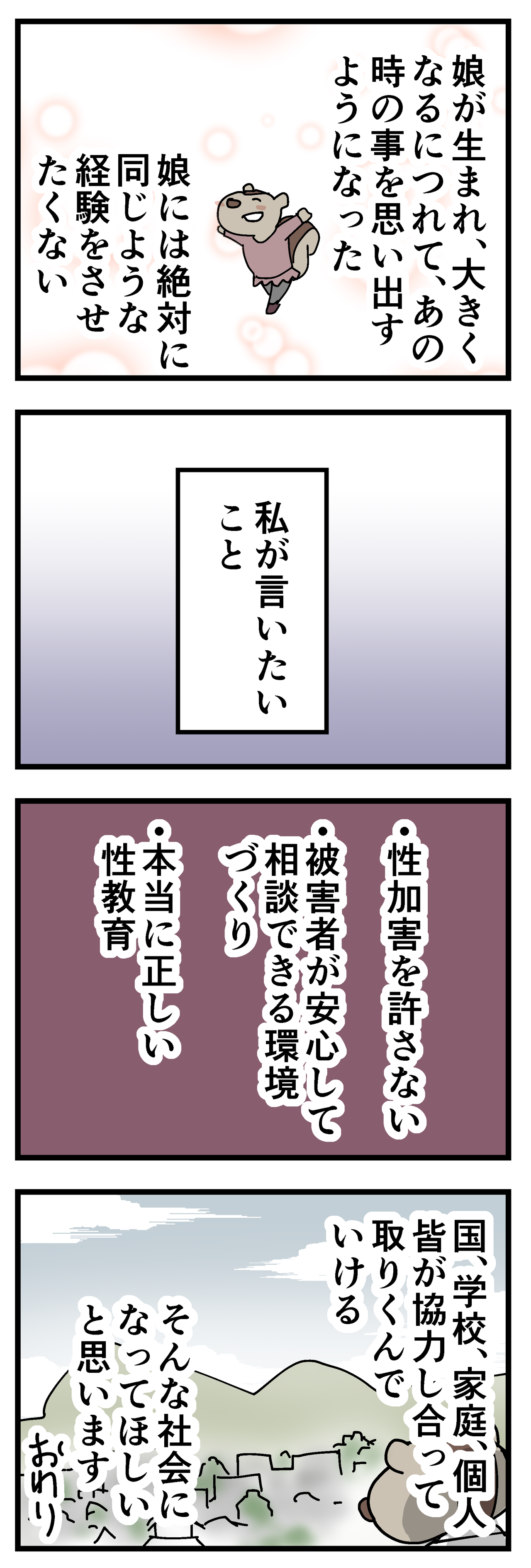いちごさんの体験談を知って、ますます早期からの性教育必要だなって思いました!細かいことはまだ先でもいいから、せめて「いけないことをされてる」という知識と「大人に相談する」という指導は必要ですよね。コメントありがとうございました!