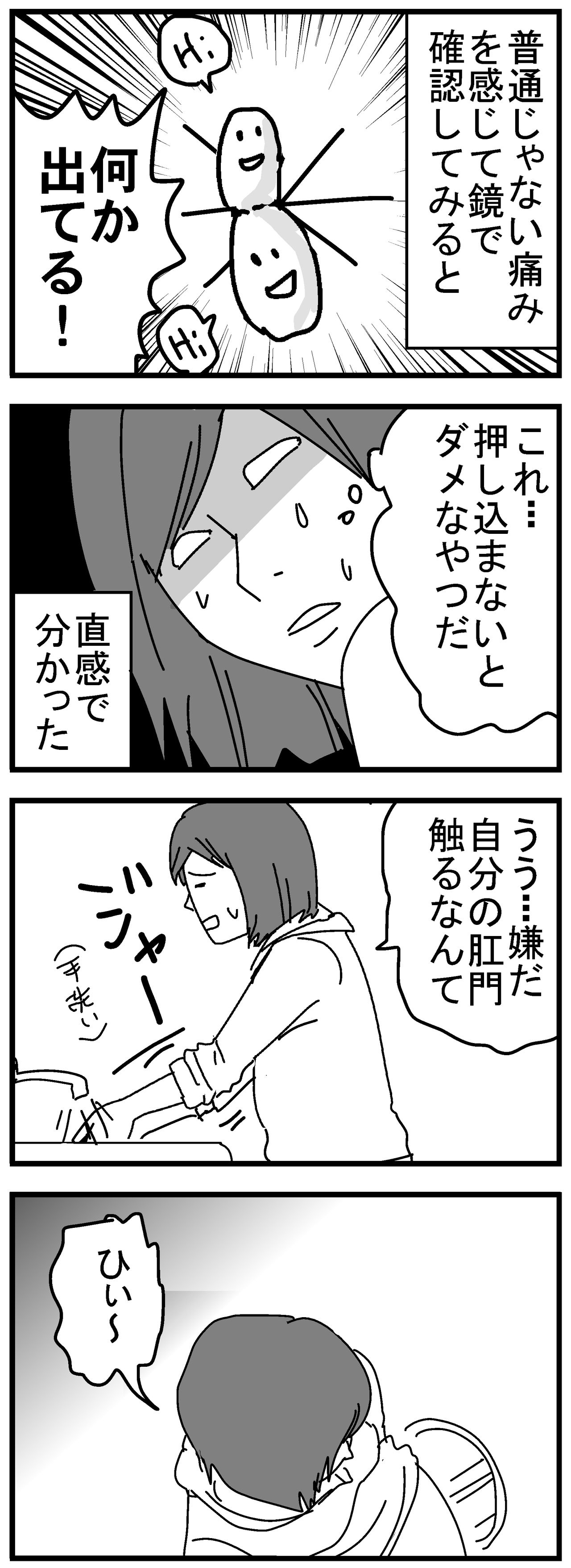 嵌頓痔核になった話3 2019年04月02日 1話目はこちら前回の続きです。明らかにヤバイ中身が出てました…。これ絶対、入れないとダメなやつ!と分かったので、凄く嫌だったけどチャレンジしました。手を洗い、爪が一番短かった小指で、穴周辺から滑り込ませるように押したら、意外にもすんなり入りました。ホッとしたのもつかの間…。数時間後、再び中身が出てしまったのです…(T_T)続きます。(リンク先は、記事公開後に繋がります)↓クリックで応援よろしくお願いします↓↓更新通知が届きますので、お気軽にご登録ください!↓ 「妊娠・出産」カテゴリの最新記事 < 前の記事次の記事 > コメント コメントフォーム 名前 コメント 記事の評価 リセット リセット 顔 星 情報を記憶 コメントを投稿する