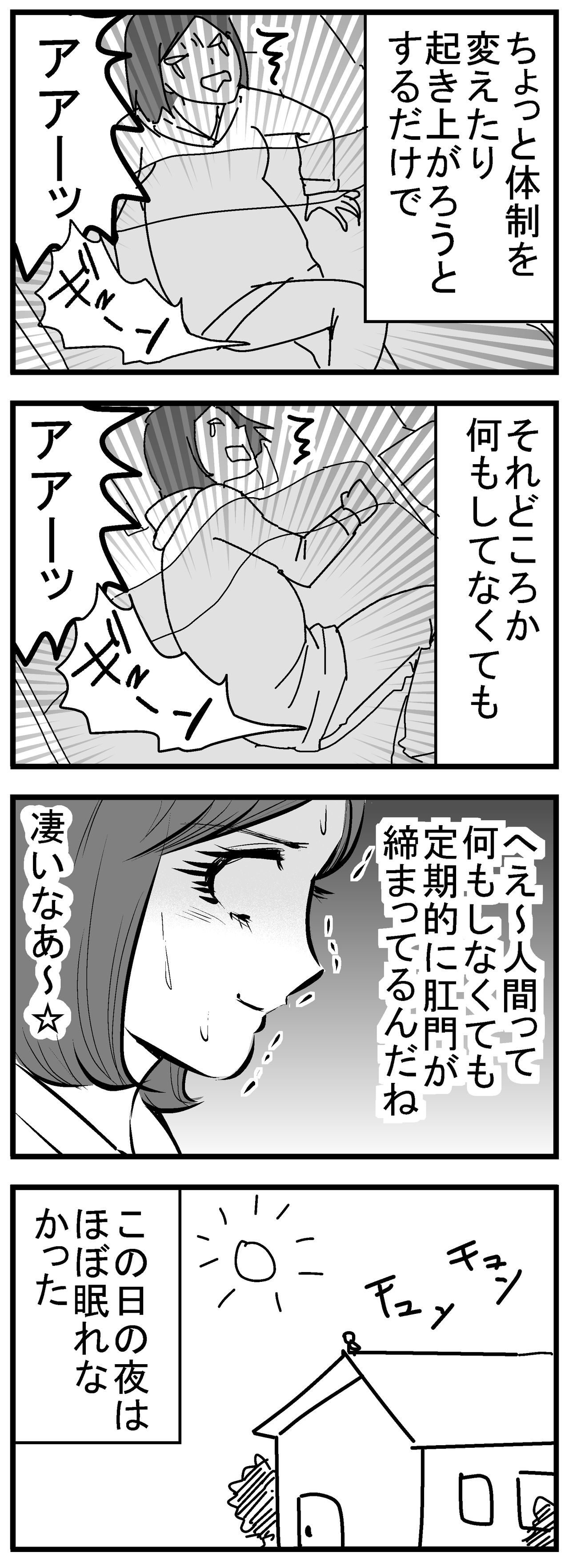 ウトウトしても、数十分おきの「ギューン」で肛門に激痛が走り飛び起きる、の繰り返しで全然眠れませんでした。