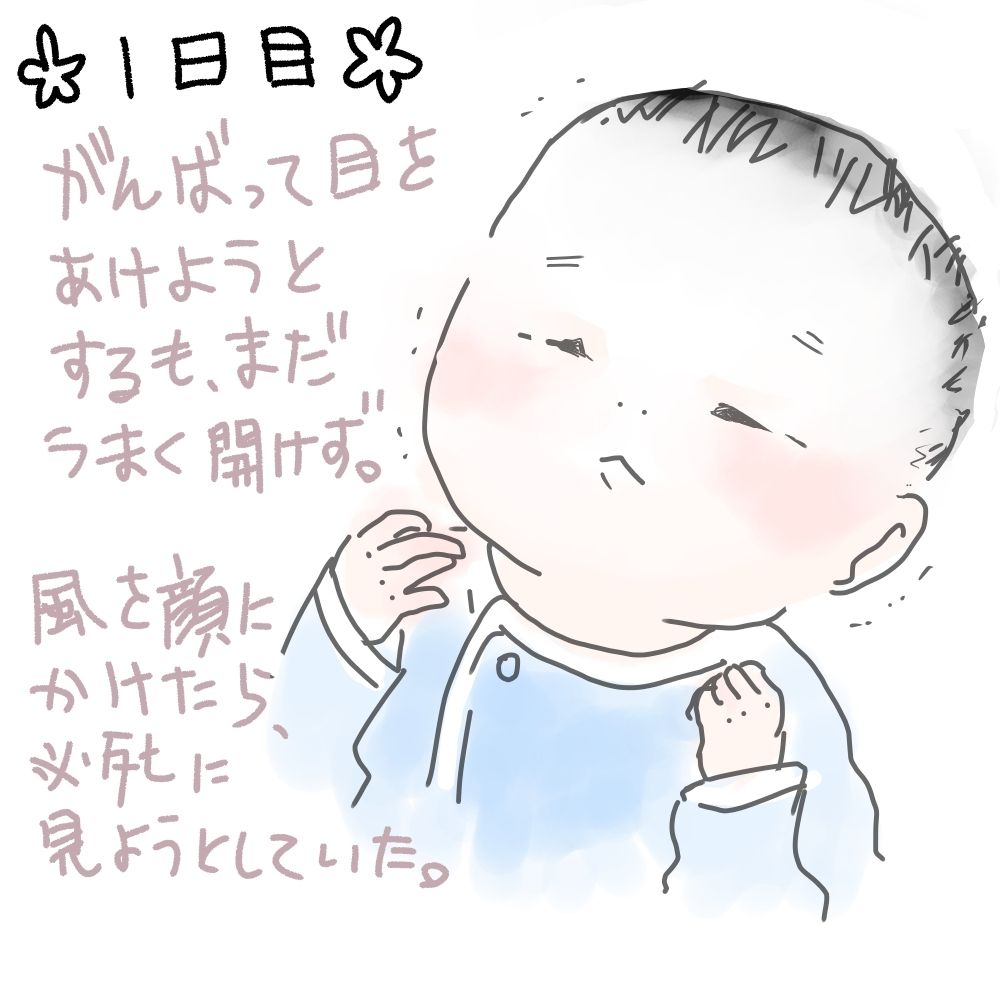 泣いてる時に顔に風をかけたら、初めての感覚に驚いたらしく頑張って目を開けようとしてて、それが可愛かったんたけど…風に反応してくれたのはその一度きりでした。残念。