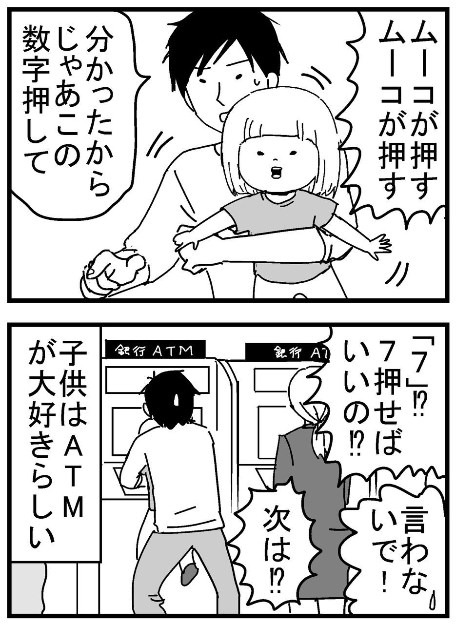休日は旦那とムーコの二人で出かける事がほとんどなのですが、お金をおろす事が何度かあり、その度にムーコが、自分が押したい!と大騒ぎするので仕方なくやらせているようです。