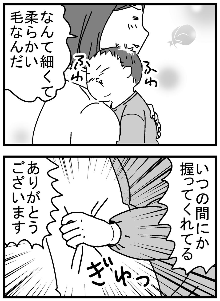 【育児漫画201】2ヶ月児からのご褒美 2019年07月28日 (2ヶ月)ようやく目が見えてきたのか、人の顔を目で追うようになってきました。しかし、こちらのアクションに対する反応はなく、まだまだ生きる事で精一杯のお年頃。それはこちらも分かってるので、お世話の見返りは求めません。そう…この程度で十分なのです。今日もありがとうございます!(※コメントは空いた時間にお返事させていただきます。遅かったり出来なかったりする事もありますがご了承ください)↓更新通知が届きますので、お気軽にご登録ください!↓↓クリックで応援よろしくお願いします↓ 「0歳」カテゴリの最新記事 < 前の記事次の記事 > コメント コメント一覧 (10) 1. ちゅーあい 2019年07月28日 23:34 息!息わかります! 鼻突っ込んで匂い嗅ぐ! サイコーにいい匂い!未だにやっちゃう! 0 ちくまサラ がしました 2. ちくまサラ 2019年07月29日 00:28 >>ちゅーあいさん 息、いいですよね! 汚れを知らない神聖な匂いがします笑 0 ちくまサラ がしました 3. 6ヶ月育児中 2019年07月29日 07:03 あああああ! 尊い……! 6ヶ月の目が合うだけでにこっとかころりんテヘへも可愛いけど、この2ヶ月の世俗離れした尊さ……! 我が家に来てくださりありがとうございます!(スライディング土下座)ってなりますね~♥️ 0 ちくまサラ がしました 4. ちくまサラ 2019年07月29日 14:28 >>6ヶ月育児中さん まだまだ人間ぽくないあたり、尊み感じますよね✨ でも6ヶ月もめっちゃ可愛いですよ!!むしろ私は記憶から消えてしまってるので、そんなだっけ!?という感じです😂ナナオがそうなるのを楽しみにしておきます笑! 0 ちくまサラ がしました 5. かえぼー 2019年07月29日 20:45 握ってる!かわいいですよね(。>﹏<。) 置こうと思ったら握ってた!みたいな(^^) 0 ちくまサラ がしました 6. ちくまサラ 2019年07月29日 22:19 >>かえぼーさん 意外と力が強いのがまたいいですよね! ホコリも巻き取りますけど笑 0 ちくまサラ がしました 7. まつこ 2019年08月01日 01:47 握ってる!ありがとうございます!にめっちゃ共感(笑) 抱っこしてたら、初めて首に手を回してくれたとき、思わず写真撮ったもの…(笑) 0 ちくまサラ がしました 8. ちくまサラ 2019年08月01日 02:31 >>まつこさん 共感嬉しいです! 首に手を回す…!それ感激ですねー!私も上の子の「初めての◯◯」みたいなの、よく写真とってました!あとから見返して「何でこんなの撮ったんだ?ああ、初めての時か」ってなってました。気付かないうちに当たり前になってるんですよねー。 0 ちくまサラ がしました 9. ちひろ 2019年08月01日 23:16 ブログ一気見しましたー! 私も今年の5月に出産しました^_^ サイズ感といいご褒美といい 伸びのきゅ〜っと感といい! わかるーわかるー( ;∀;)です! まだ3ヶ月弱しかたってないのに もう懐かしい感じがする… 新鮮な気持ち思い出しました! もう今や7kg超…腕ムキムキなりました 0 ちくまサラ がしました 10. ちくまサラ 2019年08月02日 00:37 >>ちひろさん 見てくださりありがとうございます! 同じくらいに出産されたんですねー!しかも7キロ!?うちは6キロいかないくらいなのに、私の抱っこの体勢か添い寝の姿勢が悪かったのか、首が痛くなり曲がらなくなってしまいました(T_T)ちひろさんもお気をつけください! 0 ちくまサラ がしました コメントフォーム 名前 コメント 記事の評価 リセット リセット 顔 星 情報を記憶 コメントを投稿する
