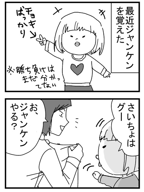 【育児漫画78】サンシャイン・ムーコ 2018年08月31日 (2歳8か月)何かしら余計な事を教える旦那ですが、今回はジャンケンでサンシャイン池崎を教えてました…。まだ普通のジャンケンすら覚えてないのに、いいのかそれで…。最近は娘もちゃんと普通のジャンケンをするようになったんですが、まだ勝ち負けは分かってないようです