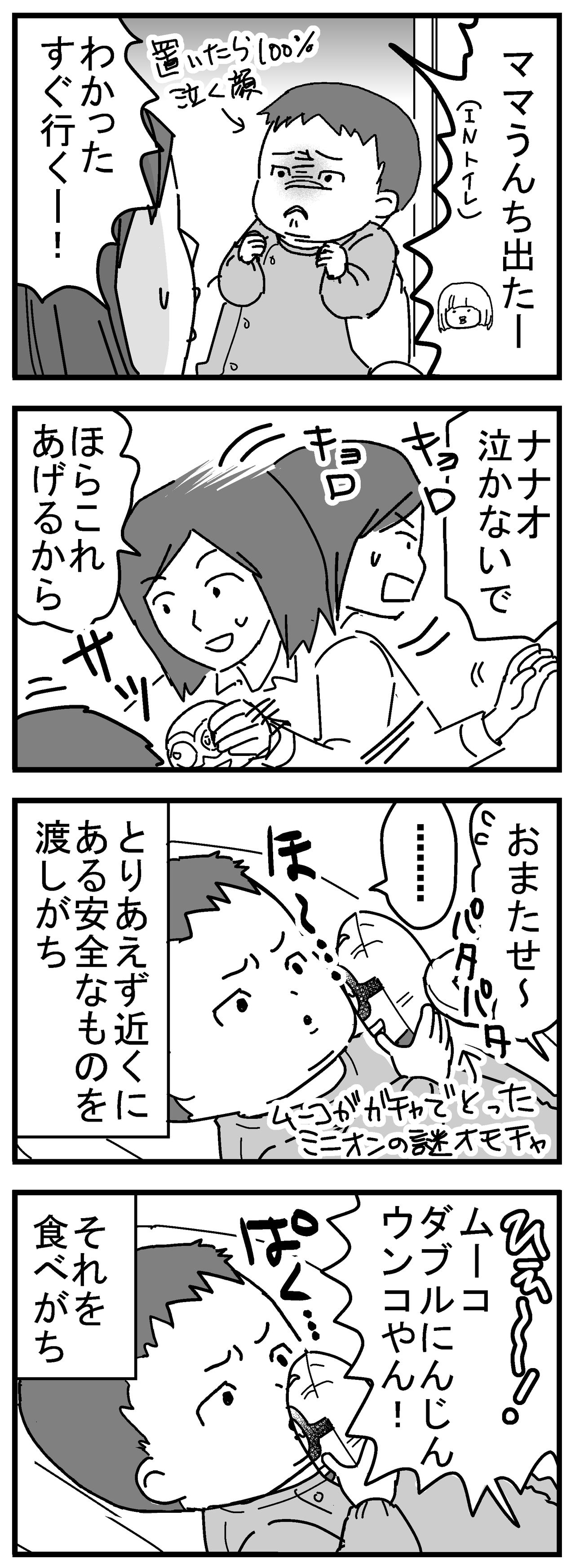 【育児漫画234】グズる赤ちゃんにやりがちなこと 2019年11月07日 (5ヶ月)とりあえず、その場をもたせることができそうな物を渡すよね。誰でも恐らくやるのは「哺乳瓶のフタ」じゃないでしょうか。私はよくやります。ちなみにムーコは毎日大人顔負けのウンチをします。ダブルにんじんウンコは、にんじんみたいな形と大きさのウンコを2つしたという…(言わなくても分かる)↓更新通知が届きますので、お気軽にご登録ください!↓↓クリックで応援よろしくお願いします↓ 「0歳」カテゴリの最新記事 < 前の記事次の記事 > コメント コメント一覧 (4) 1. のび 2019年11月07日 11:30 ナナオくんの顔全部可愛いです^ - ^ 10ヶ月の次男はおもちゃ失敗、トイレ侵入です(´-`)離乳食始まると、あげてる時に限ってよく呼ばれる気がします、そして泣く… 0 ちくまサラ がしました 2. ゆん 2019年11月08日 14:00 やるやるーーーーーーー!笑 私は上の子が散らかしてる スポンジの積み木を渡します(∀)笑 みんなそうなんだなあ…と思うと 嬉しくなりました。笑 0 ちくまサラ がしました 3. ちくまサラ 2019年11月09日 02:49 >>のびさん ナナオの顔、まだイマイチ安定してないんですがそう言っていただけると嬉しいです~😆眉毛をよくしかめるせいか、とても表情豊かです。 10ヶ月になるともうガンガン動きますもんね💦そして私も先日、離乳食あげてる最中に宅配便が来ました😂 0 ちくまサラ がしました 4. ちくまサラ 2019年11月09日 02:52 >>ゆんさん スポンジのつみきいいですよね!義実家にあって、いまだにムーコがよく遊んでます! こないだ漫画と同じパターンで空のペットボトルを渡したら、お気に入りになったみたいで転がして遊んでます😂 0 ちくまサラ がしました コメントフォーム 名前 コメント 記事の評価 リセット リセット 顔 星 情報を記憶 コメントを投稿する