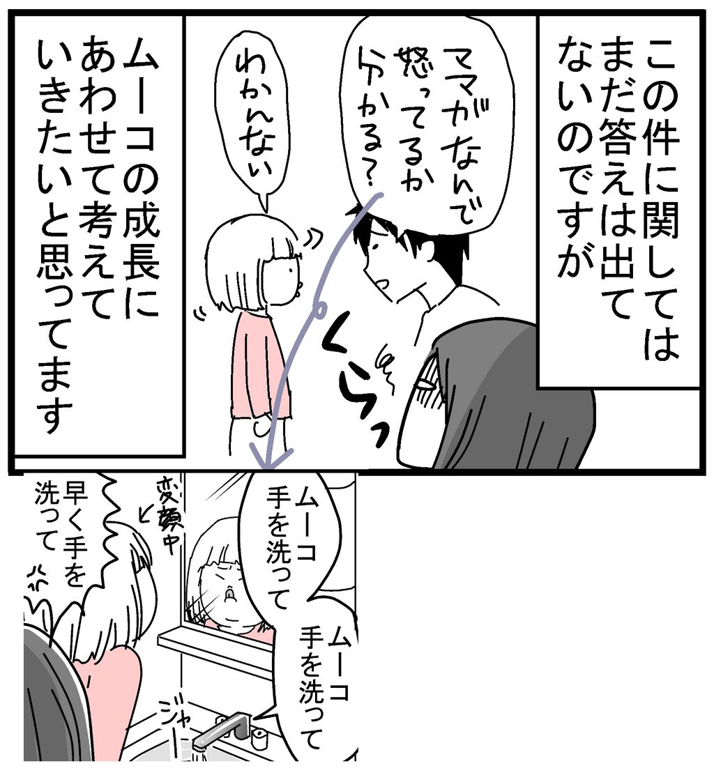 子供って次々に予想もつかない事をするから、こっちもつい反射的に叱ってしまいますよね…。私も、頭では分かってても実行するのはまだ難しく、とにかくカッとしたら立ち止まるという癖をつけてこうと思ってます😅