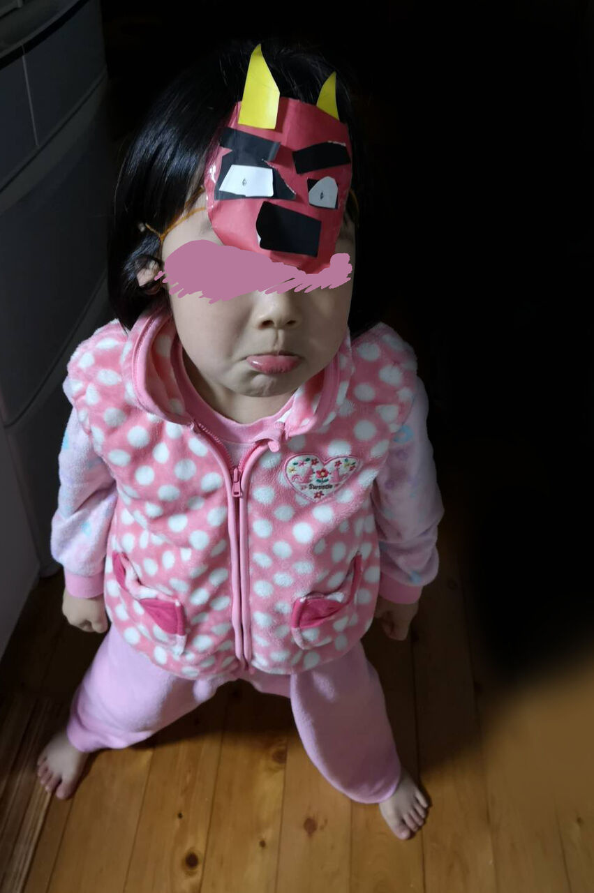 鬼のお面は、数日前に1人で勝手にハサミとノリで作っていました。