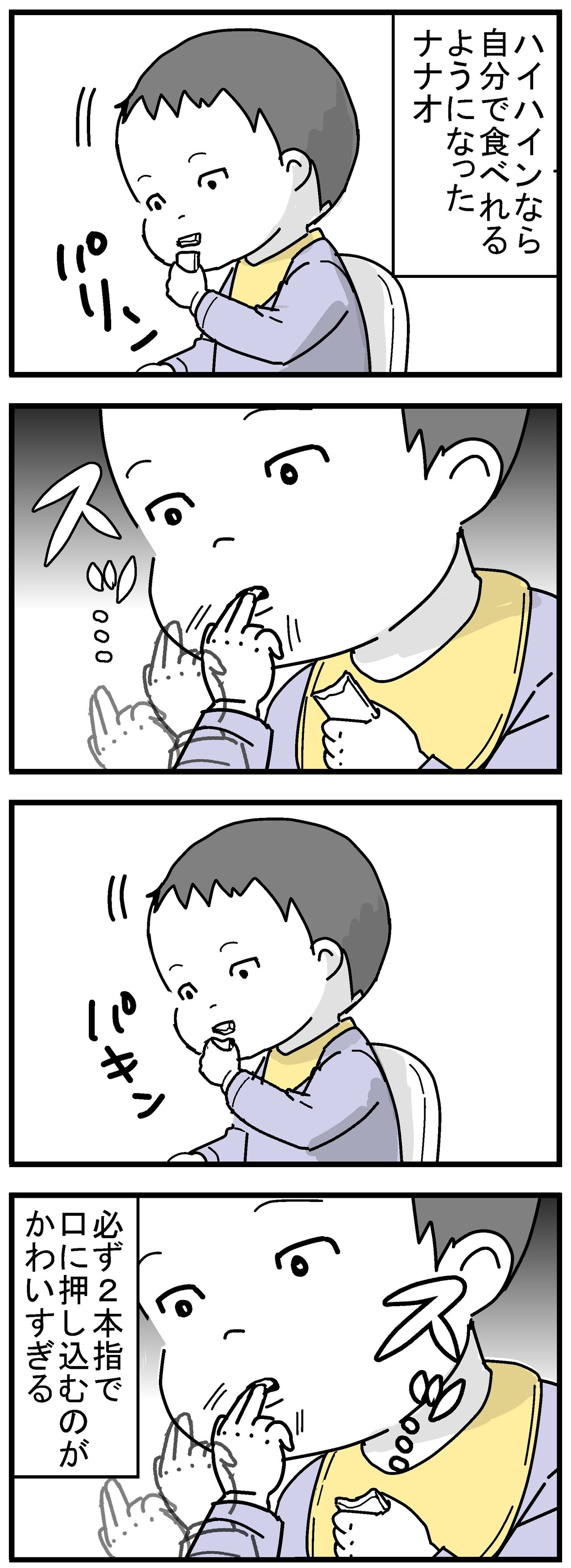ナナオくん器用で可愛いですね〜💓うちの息子も最近ハイハイン食べ始めたんですが、かじるたび唇に貼り付くのが不快なのか、しょっちゅう食べながら泣いてます(笑)