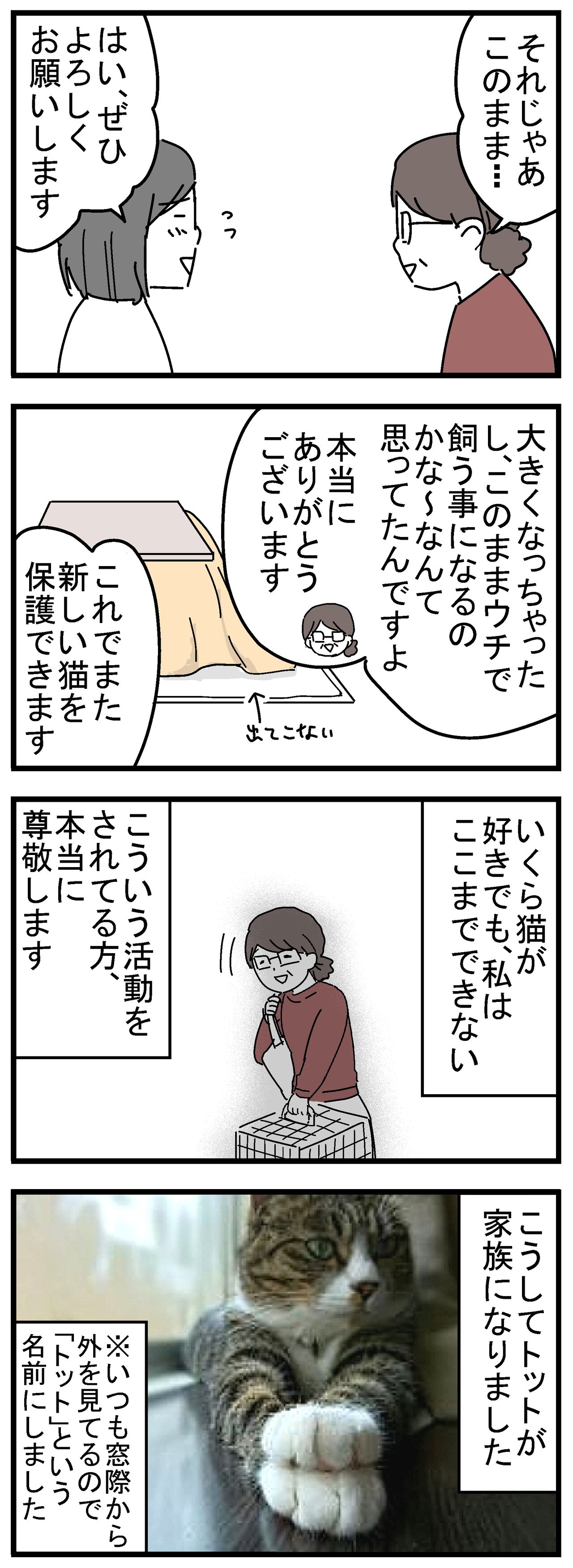 トライアル期間が過ぎ、保護主さんが再び家に来たのですが、トットは完全に無視していました(これぞ猫)