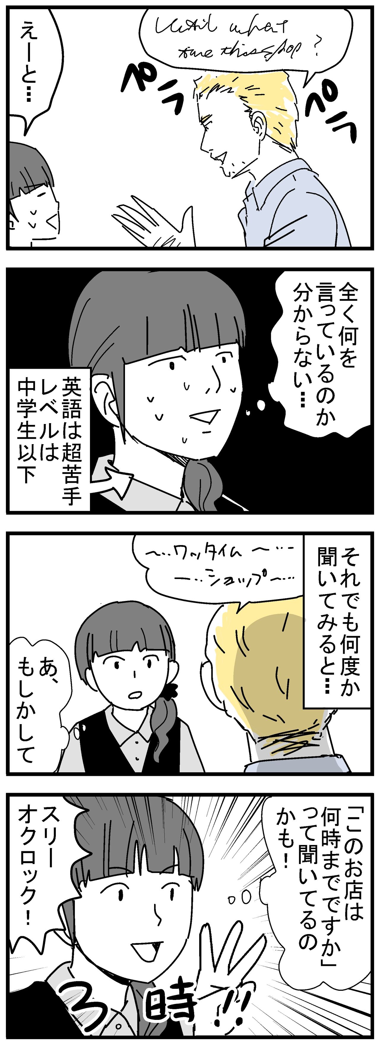 でも冷静に聞いたら、どうやら時間の事を聞いてるっぽいので、うちのお店の時間のことかな?と思い、何とか答える事が出来ました。