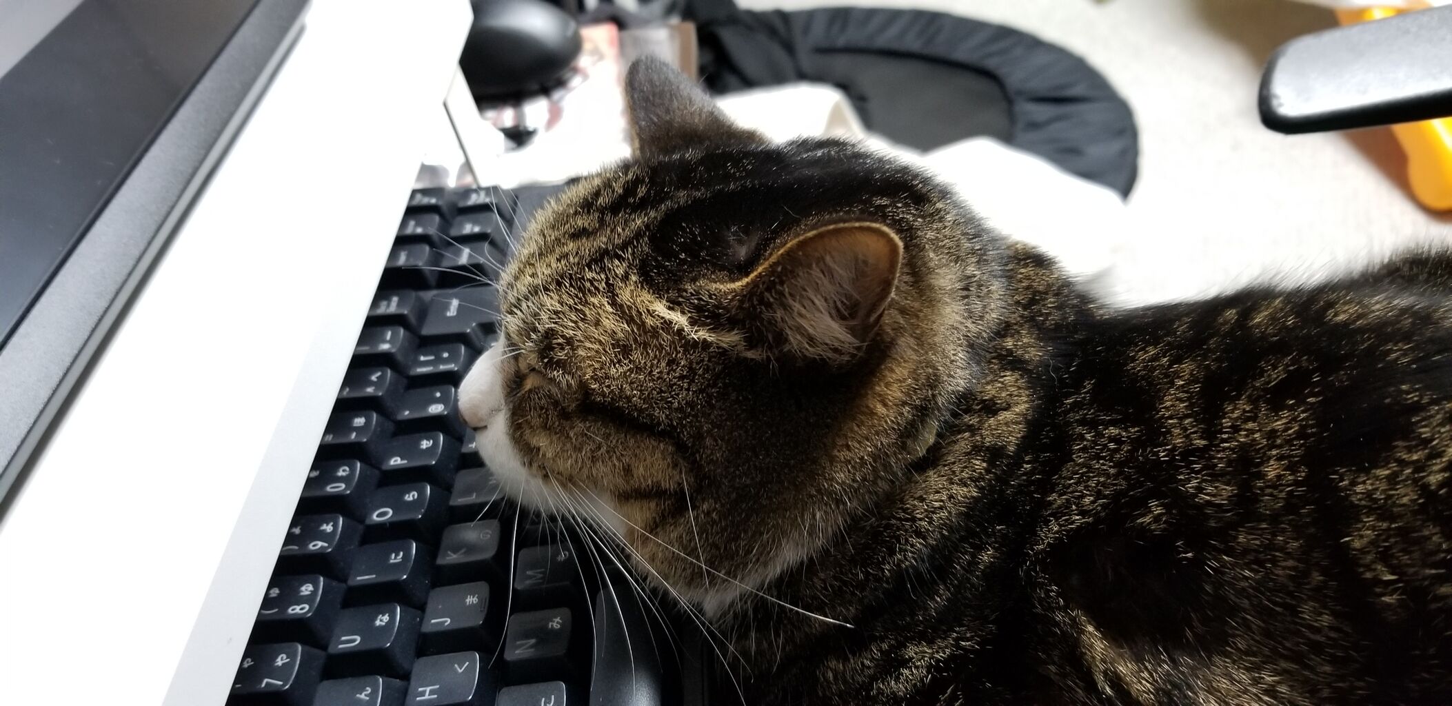 作業中の私の膝に乗り、キーボードに頭を乗せるといういやがらせ。
