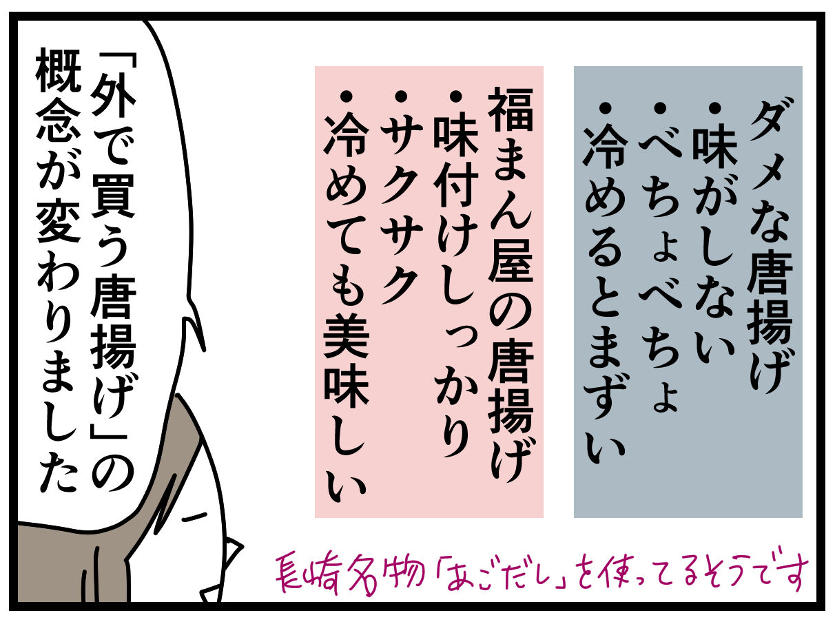 今まで食べてきた唐揚げって、例えば居酒屋なら揚げたてでザクザクだけどなんか味しねーなとか、持ち帰りのやつだとふにゃふにゃとかベトベトになってたりで、唐揚げのために外に出るっていうことをしてこなかったんですけど、今は唐揚げを買いに行くために車を走らせています(夫が)。