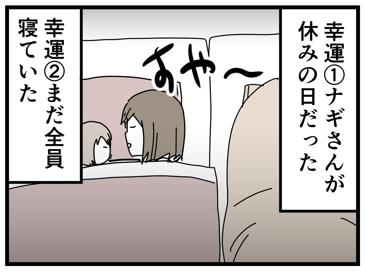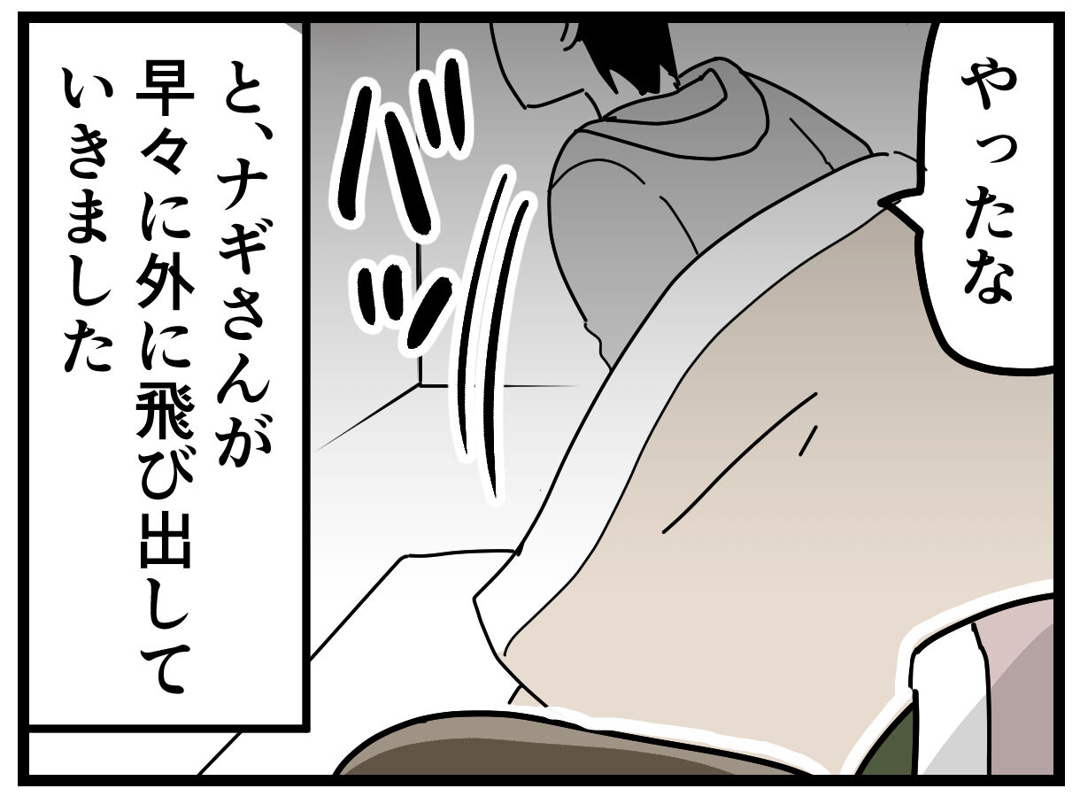 そこまで大きな音ではなく、私は「?」状態だったのですが、なぜか普段はなかなか起きないナギさんが飛び起きて、家を出ていきました。