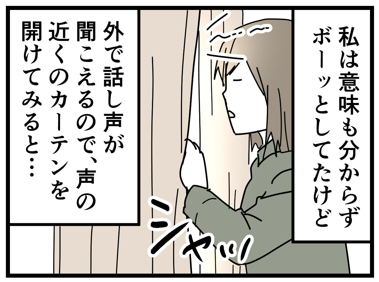 私は訳も分からないまま、声が聞こえる方の窓のカーテンを開けたんですけど、