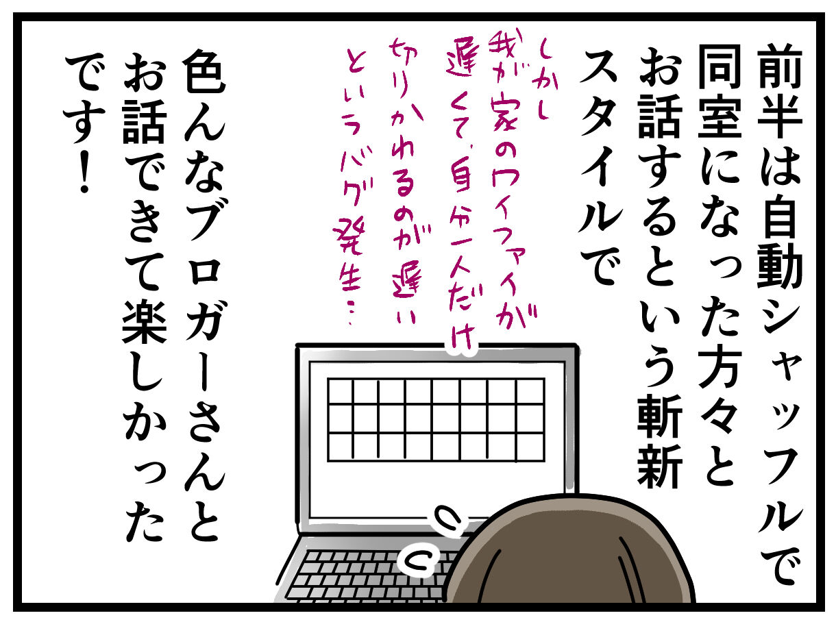 時間が来たらまた自動シャッフルされるんですけど、簡単な自己紹介だけだと時間があまり、話し込もうとすると足りないという絶妙な時間で(時間配分としては完璧です)なかなかコツがつかめませんでした。