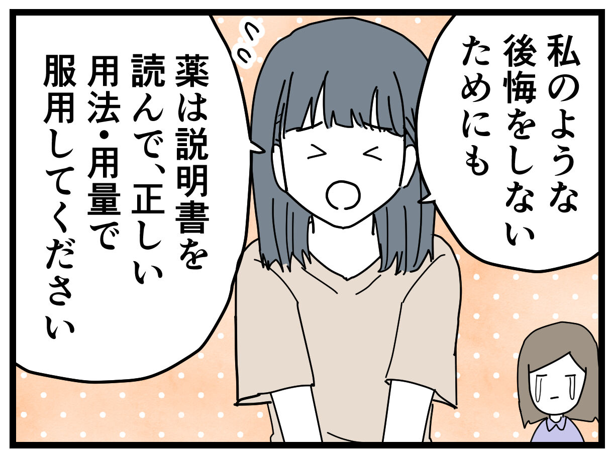 「あの時もしああしてたら薬疹にはなってなかったかも」という後悔がずっとあるらしく、そういう後悔をしないためにも説明書はしっかり読んで、少しでも違和感があったらすぐに飲むのをやめてお医者さんや薬剤師さんに相談してほしいということでした。