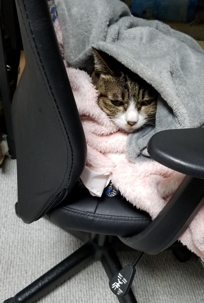 作業中は私の膝に乗っているのですが、私の作業が終わったあとも椅子に残っていて寒そうなので、こうしてくるんであげてます。
