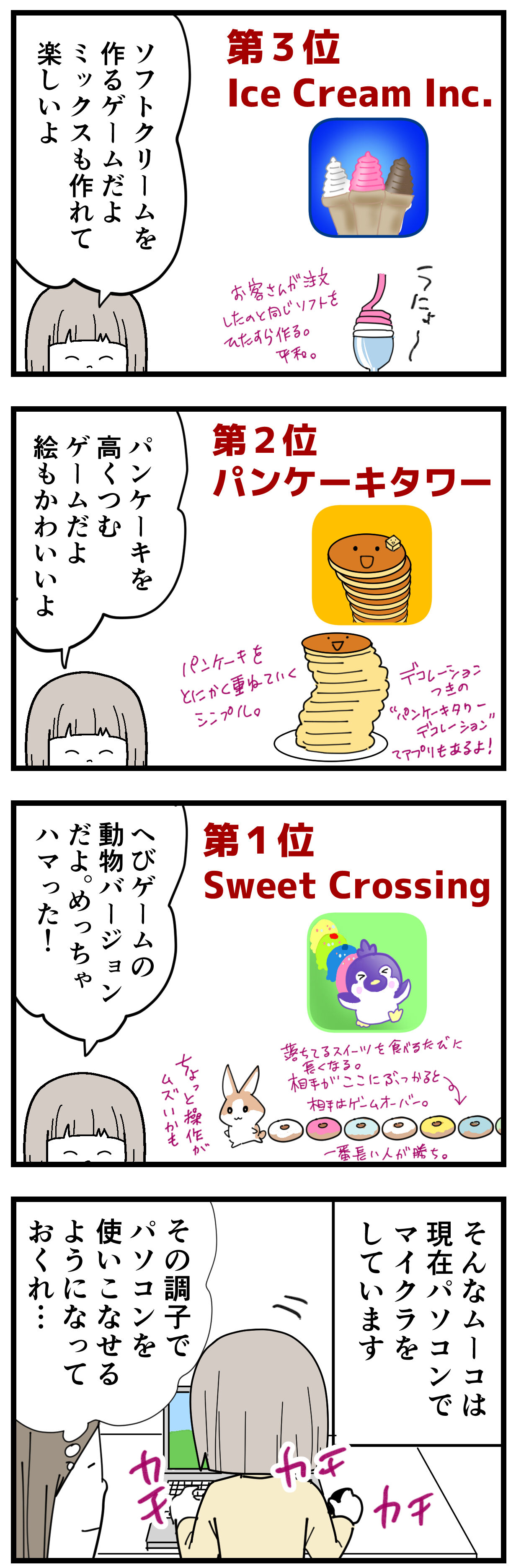 ちょっと操作が難しいから6歳くらいがいいかもしれないけど、他のアイスとホットケーキのゲームはもっと小さい子でも楽しめると思います。