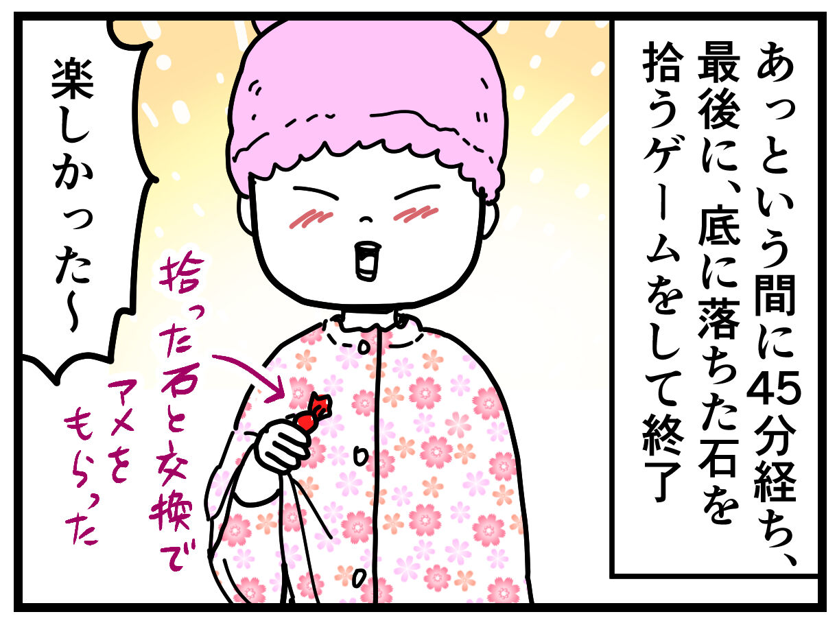 最後は石を拾うゲームで、引き換えして飴玉をゲット。私も小学生の時にやったなあ。