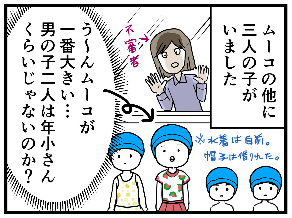 ムーコ(年長さん)が一番大きくて、次に大きい女の子(年中さんもしくは年長さん)が1人、頭一つ小さい男の子が2人でした。年少さんくらい?かなり小さかった。