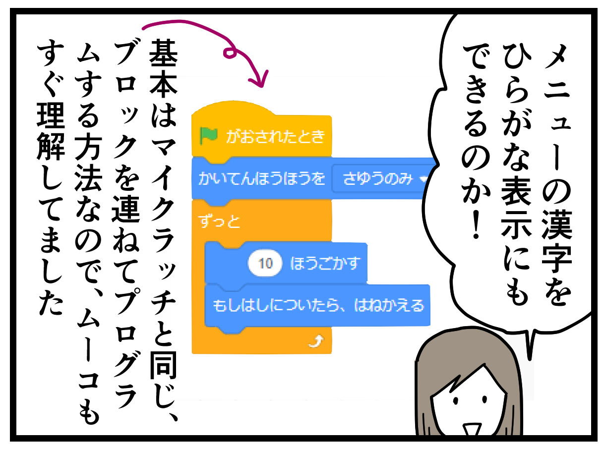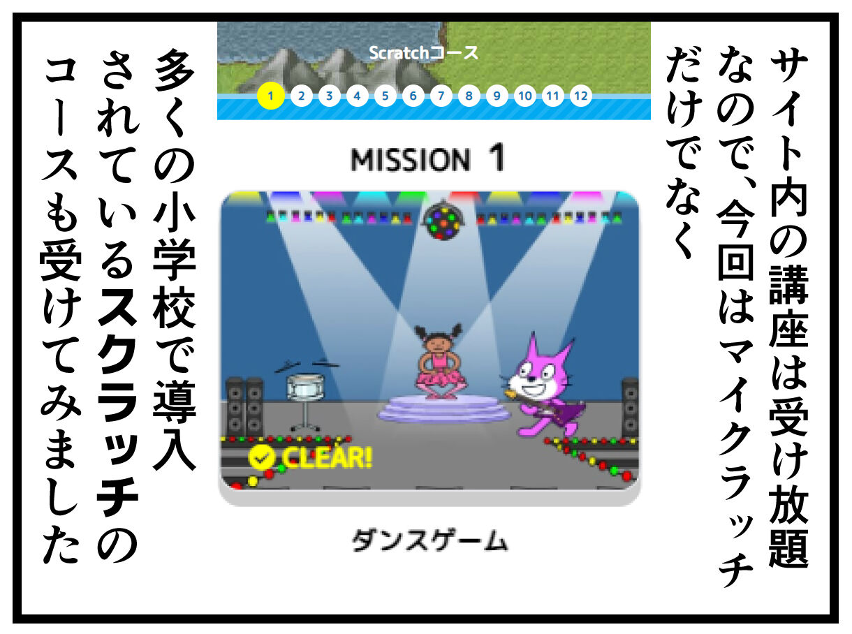 それでも今回は頑張ってマイクラッチジュニアのコース1つ(MISSION3)と、Scratchのコース1つ(MISSION1)、受けました!