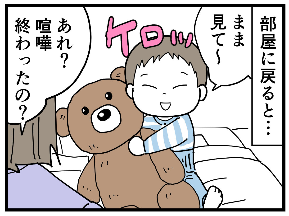 部屋に戻ってみると、泣き止んでケロっとしたナナオがクマのぬいぐるみと一緒にいたので、