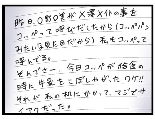 人物名がフルネームなのは、クラスが違うナミちゃんに配慮したのかもしれないけど、呼び捨てしてるあたりがもう…。