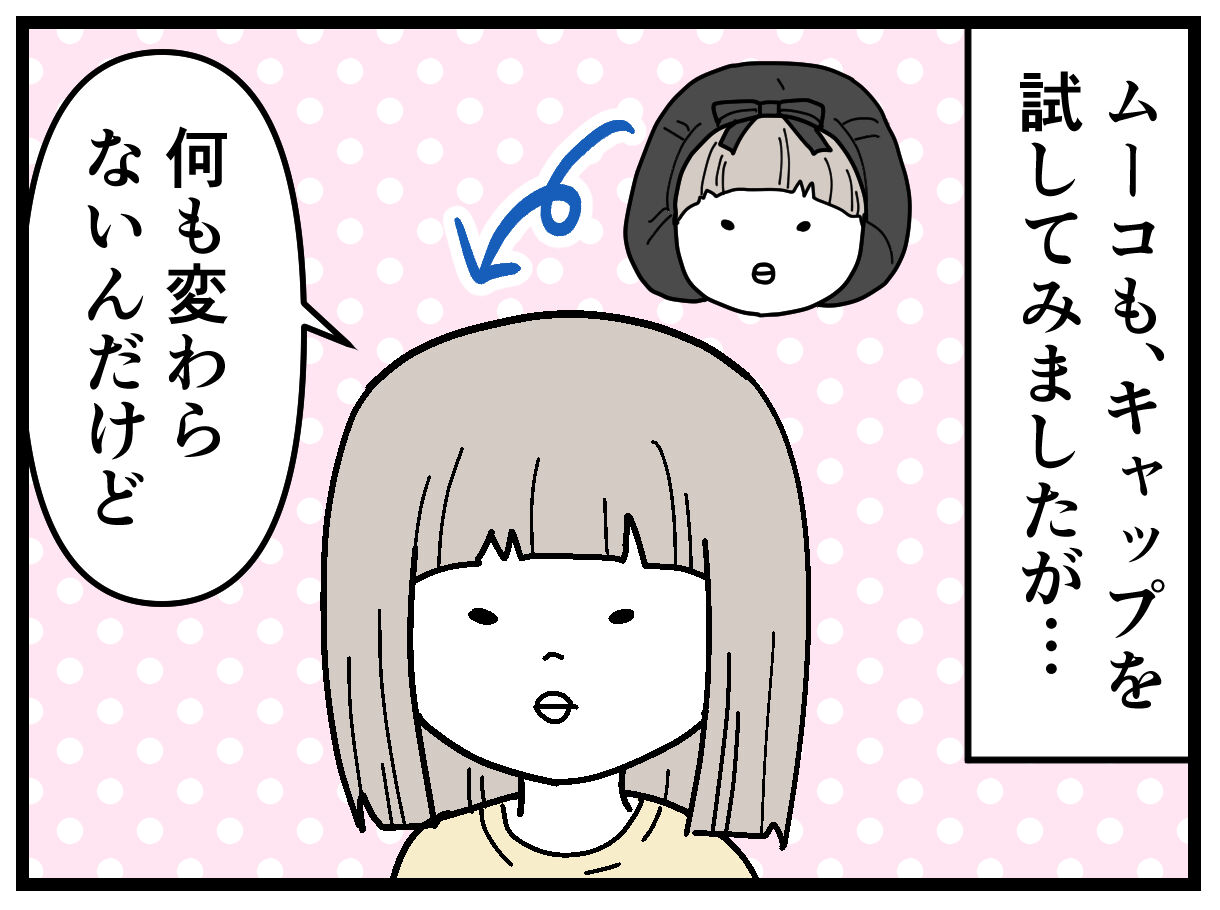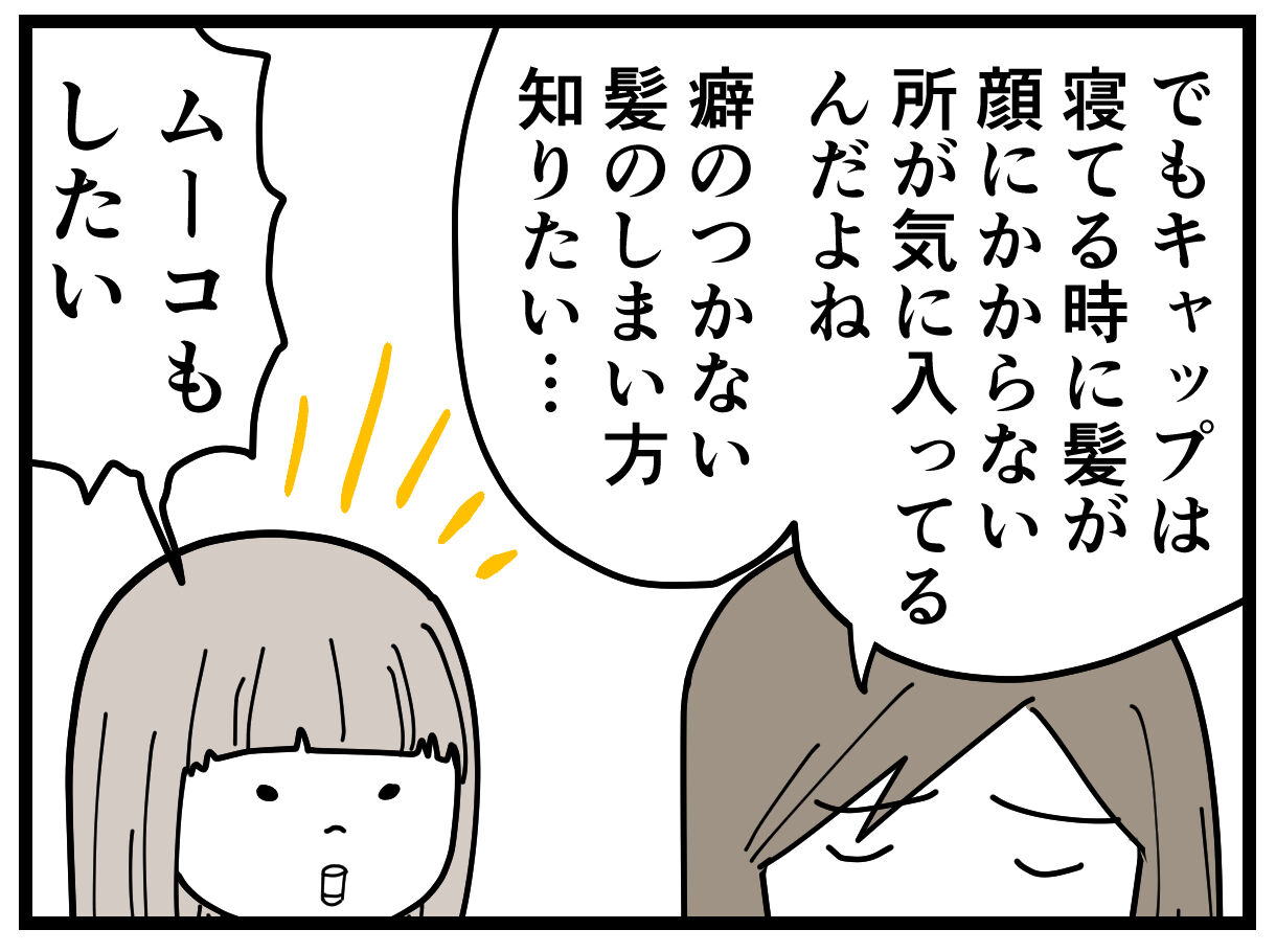 が、漫画に描いたように、キャップは寝てるときに顔や首に髪が絡まないのが良かったんですよね。