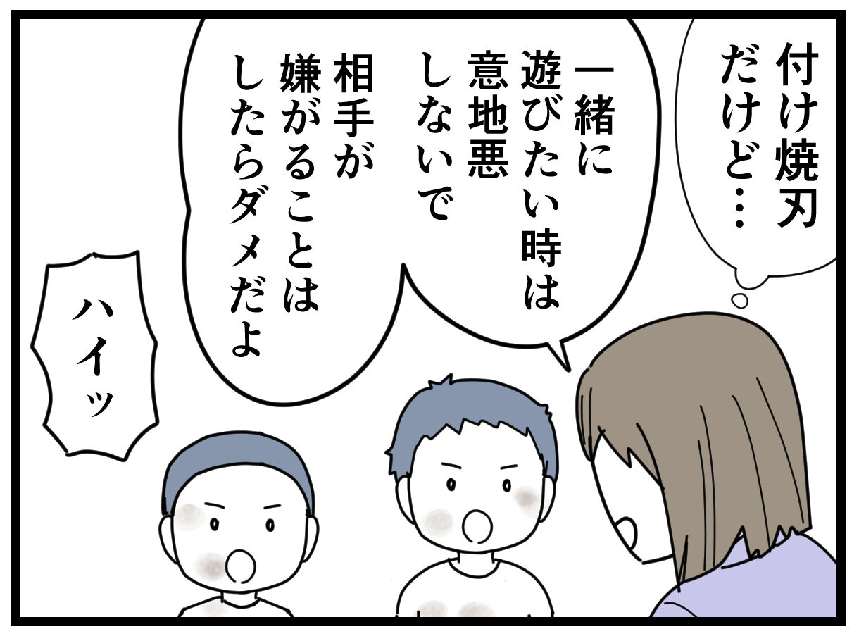 寂しいから意地悪するんでしょうけど、それを周りの大人がサーっと避けてスルーすると、その子達はだんだん歪んでいきます。本当に手の付けられなります。
