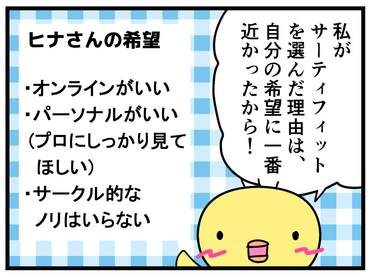 ヒナさんいわく、サーティフィットは基本的に受け身タイプのサービス。