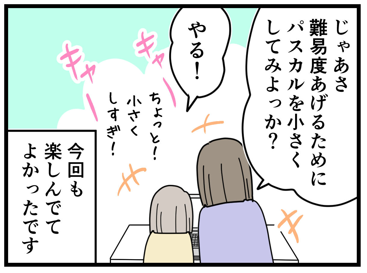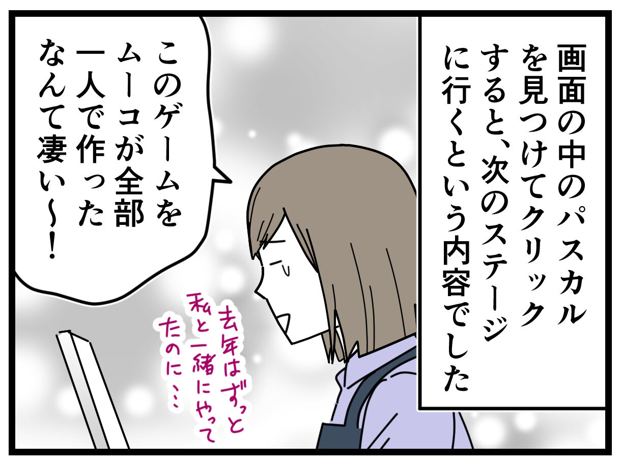 去年は初めてのプログラミングということもあり、年齢的なものもあって、分からなくてイライラしてしまったり、途中で集中力が切れてしまっていたので、今回一人でゲームを作れたムーコに感動しました。