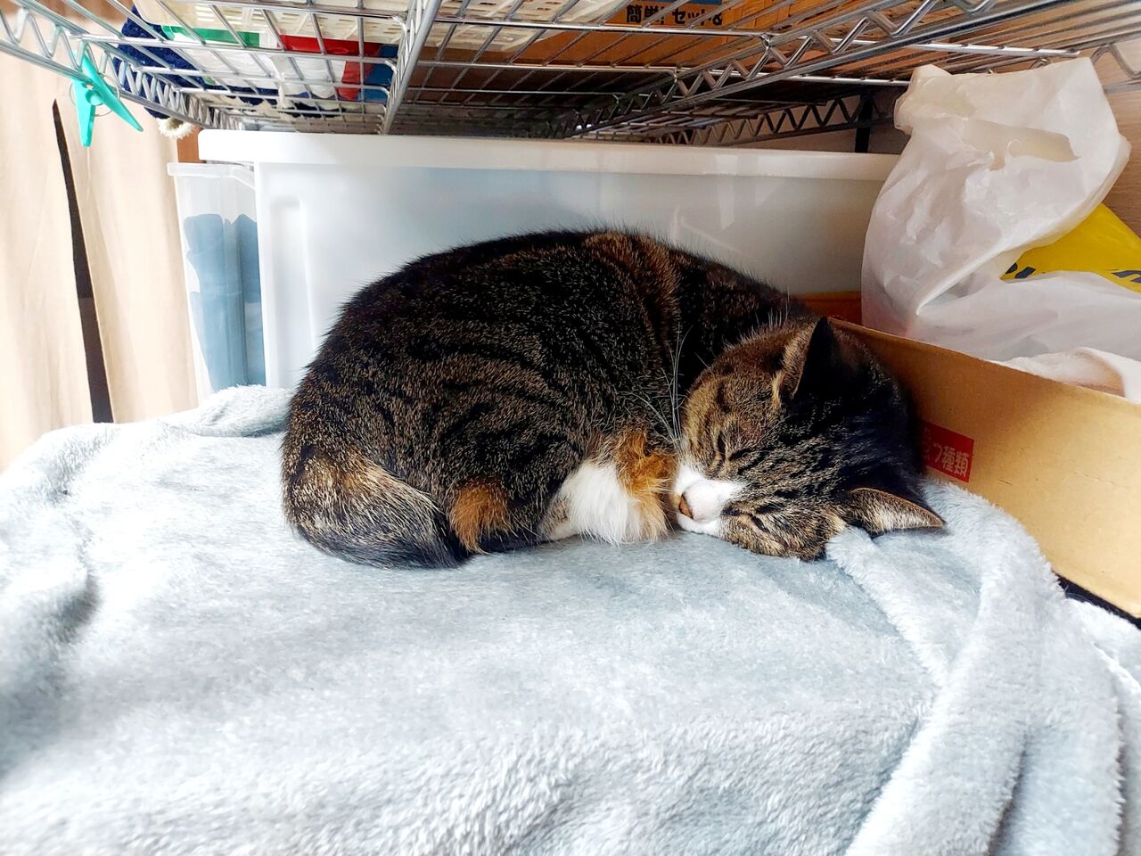 なぜかスチールラックの隙間を気に入ってしまったので(多分エアコンの風が当たってあったかいんだと思う)