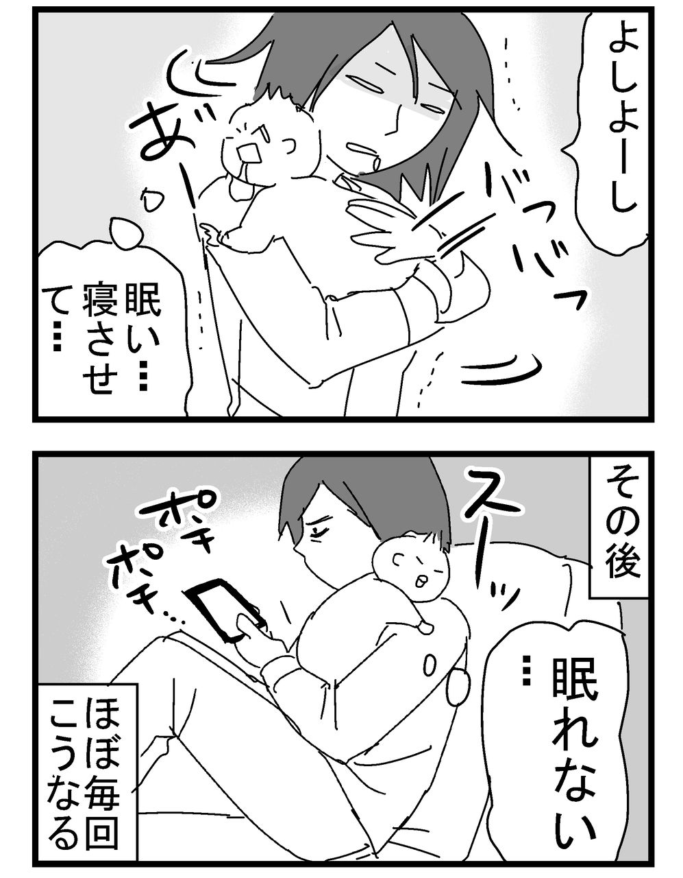 その後、自分の睡魔と闘いながら赤ちゃんを抱っこして立ち上がり、ユラユラ。